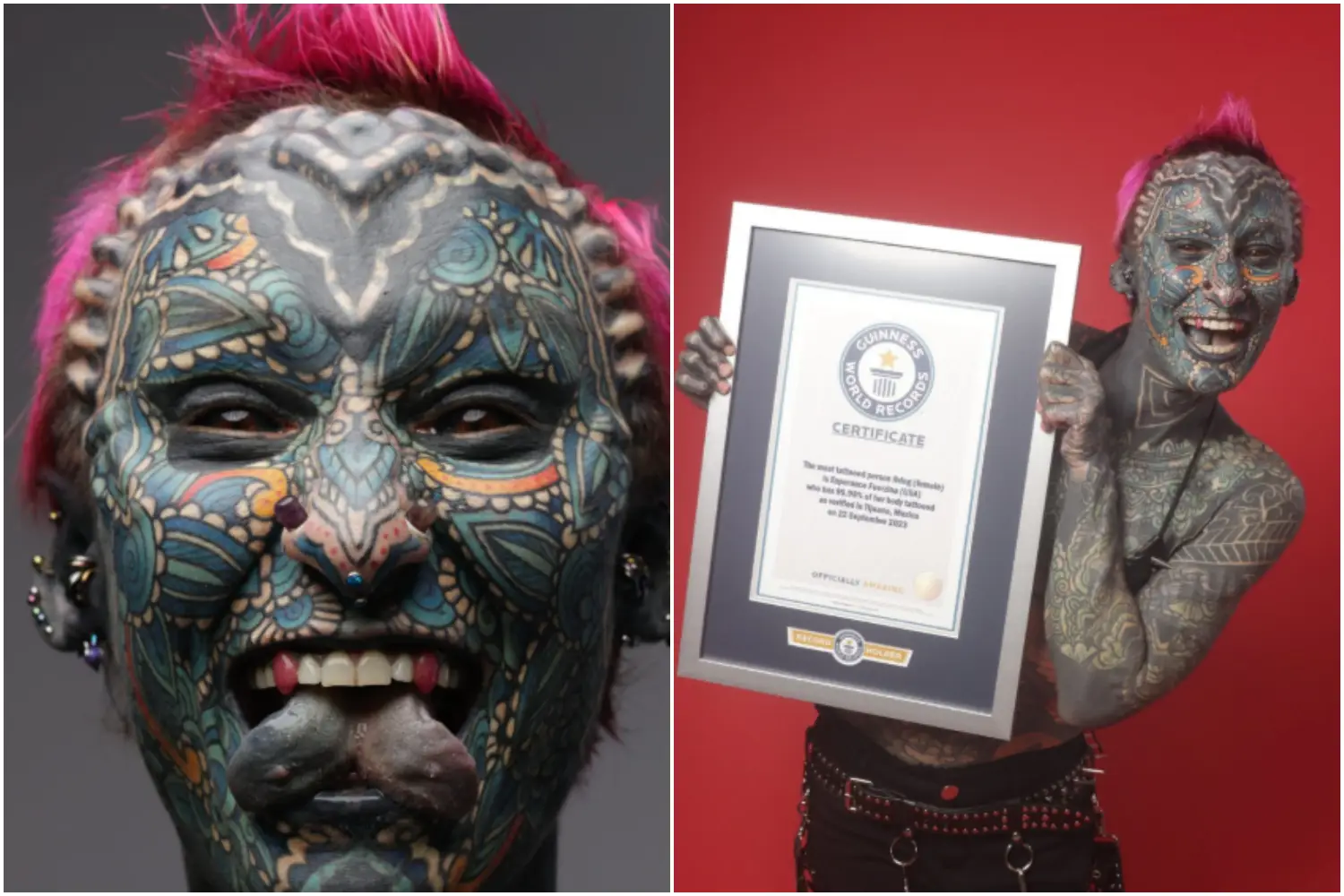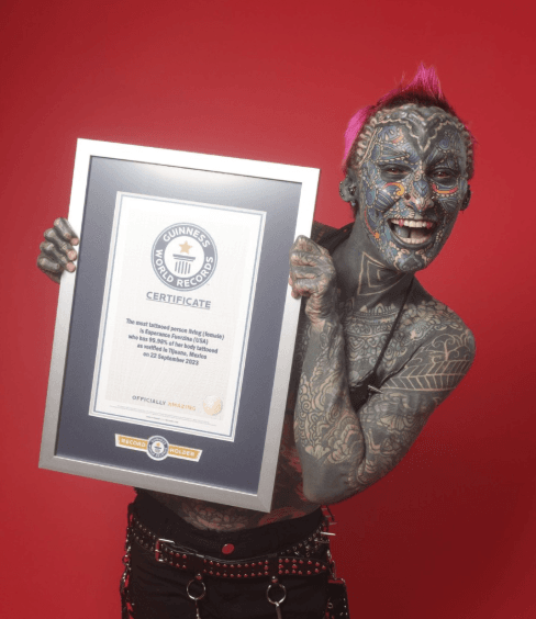 S’il y a une chose que l’on peut dire avec certitude, c’est que la peau peut raconter des histoires. Mais pour Esperance Fuerzina, cela va bien au-delà. Originaire de Bridgeport, aux États-Unis, Esperance détient le record Guinness de la femme la plus tatouée au monde, couvrant 99,98 % de son corps d’encre permanente.