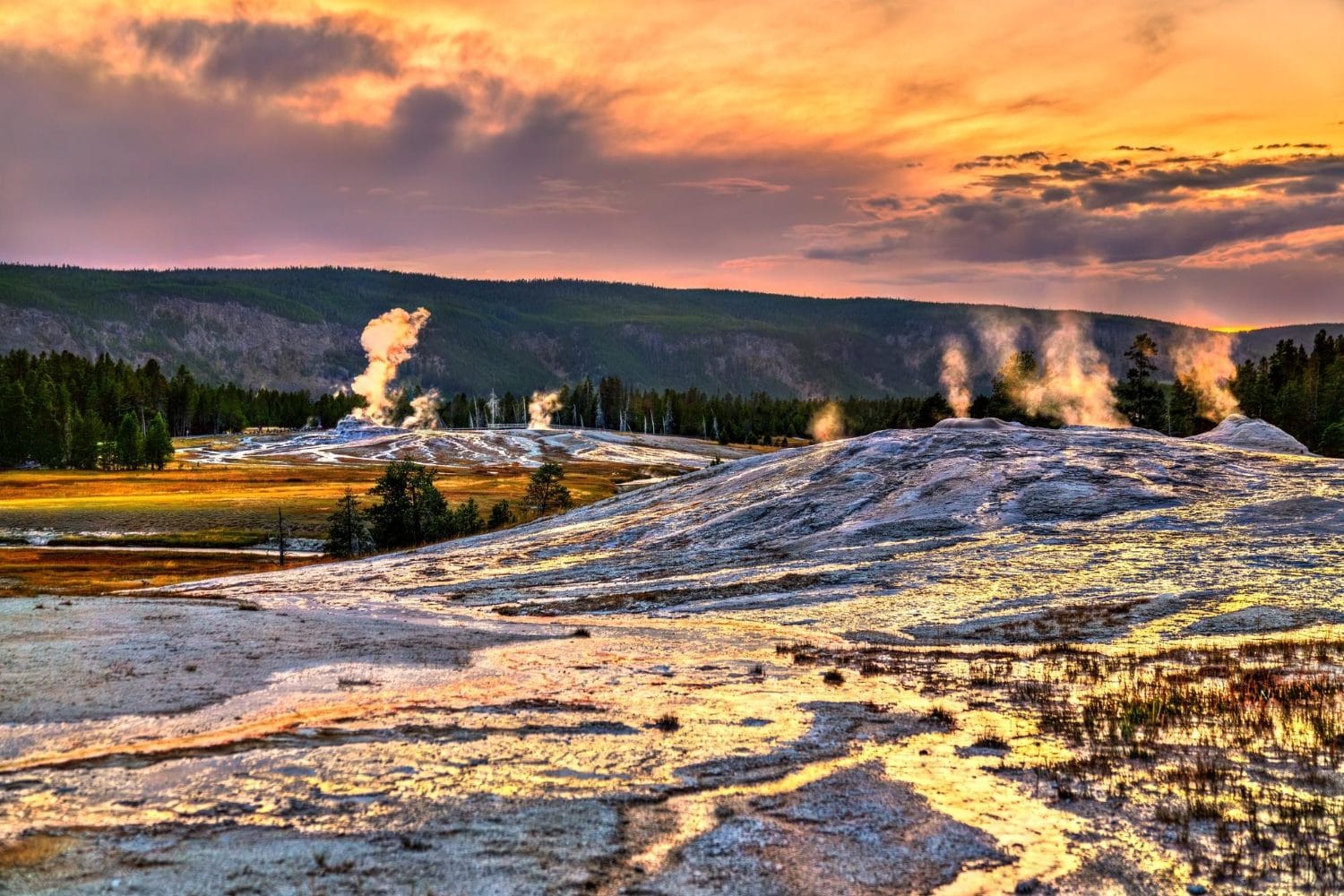 Contrairement à l’image classique du volcan en forme de cône, Yellowstone n’est pas une montagne isolée. Le cœur du système repose sur une vaste caldeira, une gigantesque cuvette formée après l’effondrement du toit du volcan lors d’une ancienne éruption monstrueuse. Cette caldeira mesure des dizaines de kilomètres de large, si grande qu’elle est difficile à percevoir sur place, sauf en regardant des cartes ou des images satellites.